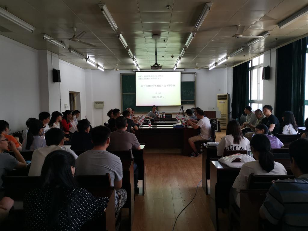 6月5日上午,副董事长苏文甫以《新冠疫情对世界格局和秩序的影响》为题,在雁塔校区2教402室为伟德国际victor1946全体教工党员讲授专题党课。计算机公司党委书记蔡建文主持本次党课学习。