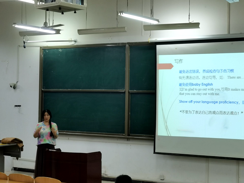 武绒老师的专项讲座主要从写作、翻译的答题技巧等方面进行讲授。CET-4考试中,在保证句子完整性的前提下,高级句式才是得分的关键。不管是写作还是翻译,正例反说,反例正说,视角转换等方法的运用都可以起到画龙点睛的作用。最后武老师针对CET-4考试时间分配进行了详细的讲解,并表示保持良好的应试心态是应对考试的必胜法宝。