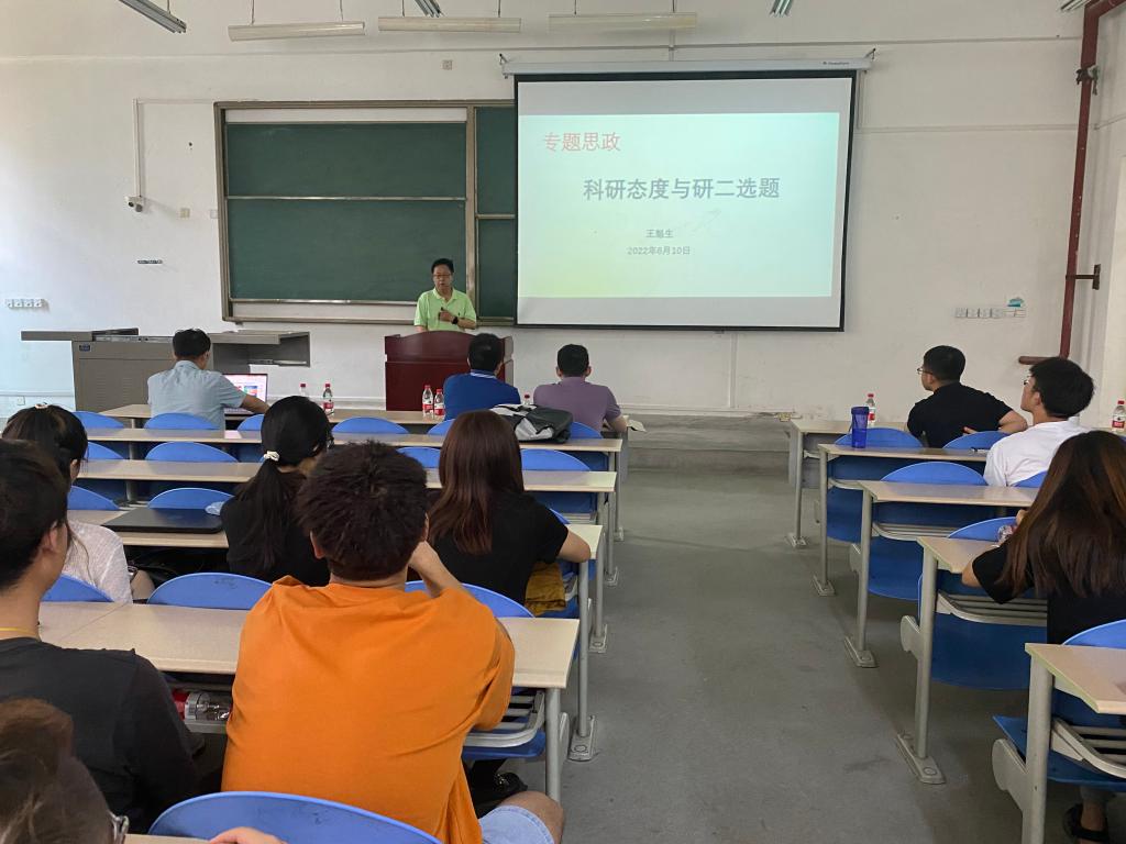 6月10日,伟德国际victor1946经理、党委副书记王魁生在鄠邑校区博思楼102教室为2021级研究生讲授专题思政课。2021级研究生辅导员田嘉兴主持,一百余名研究生参加。