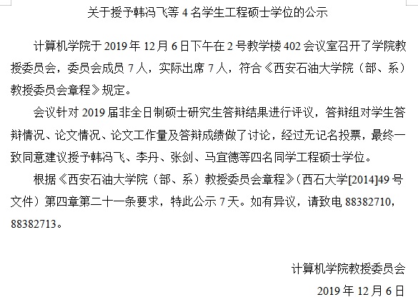 关于授予韩冯飞等4名员工工程硕士学位的公示